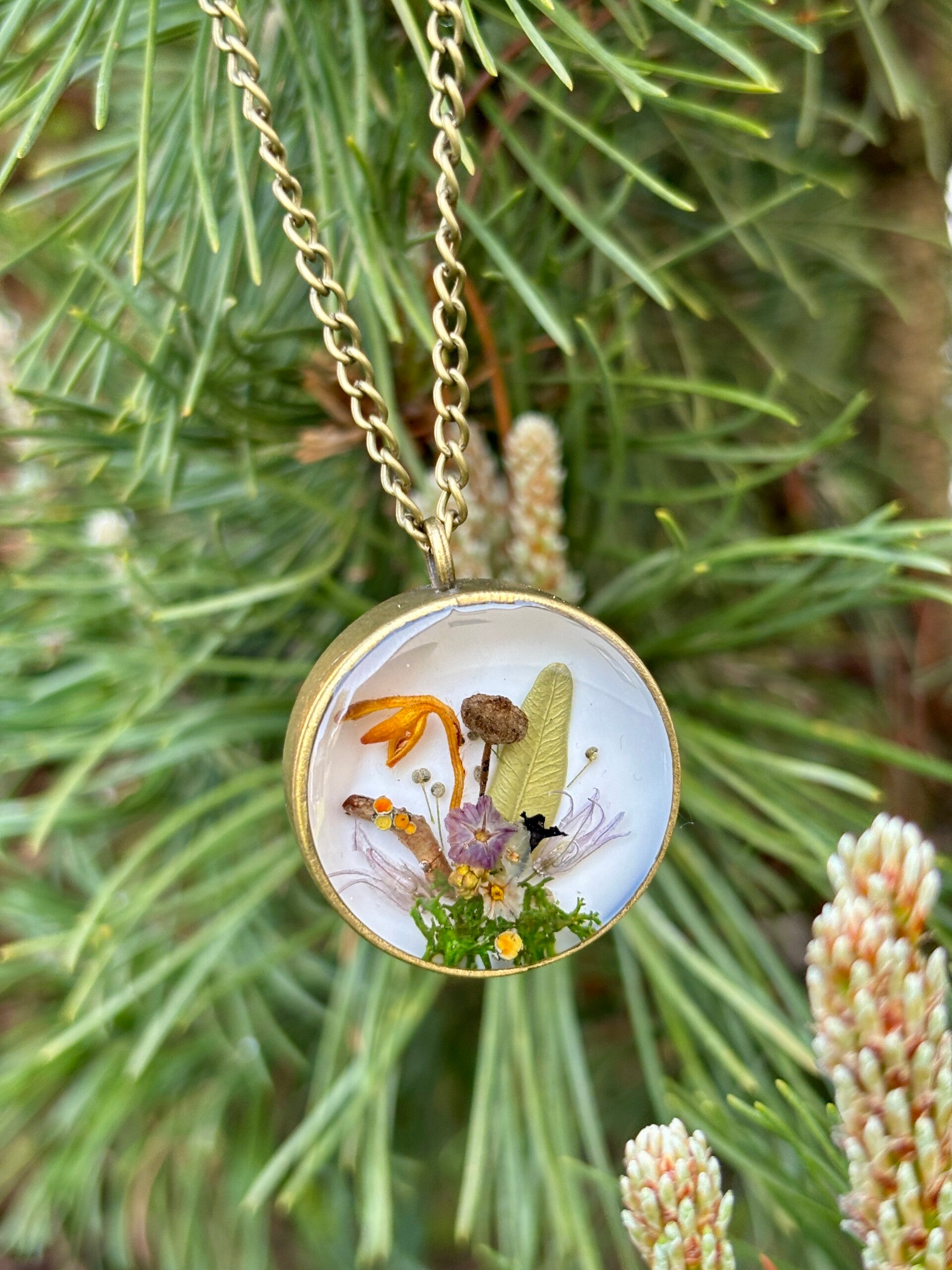 Diese besondere Halskette bewahrt die Schönheit echter Waldpflanzen in klarem Epoxidharz. Moos, Flechten, ein kleiner Pilz und zarte Blüten werden sorgfältig gesammelt, getrocknet und anschließend in Handarbeit in den Anhänger eingebettet.