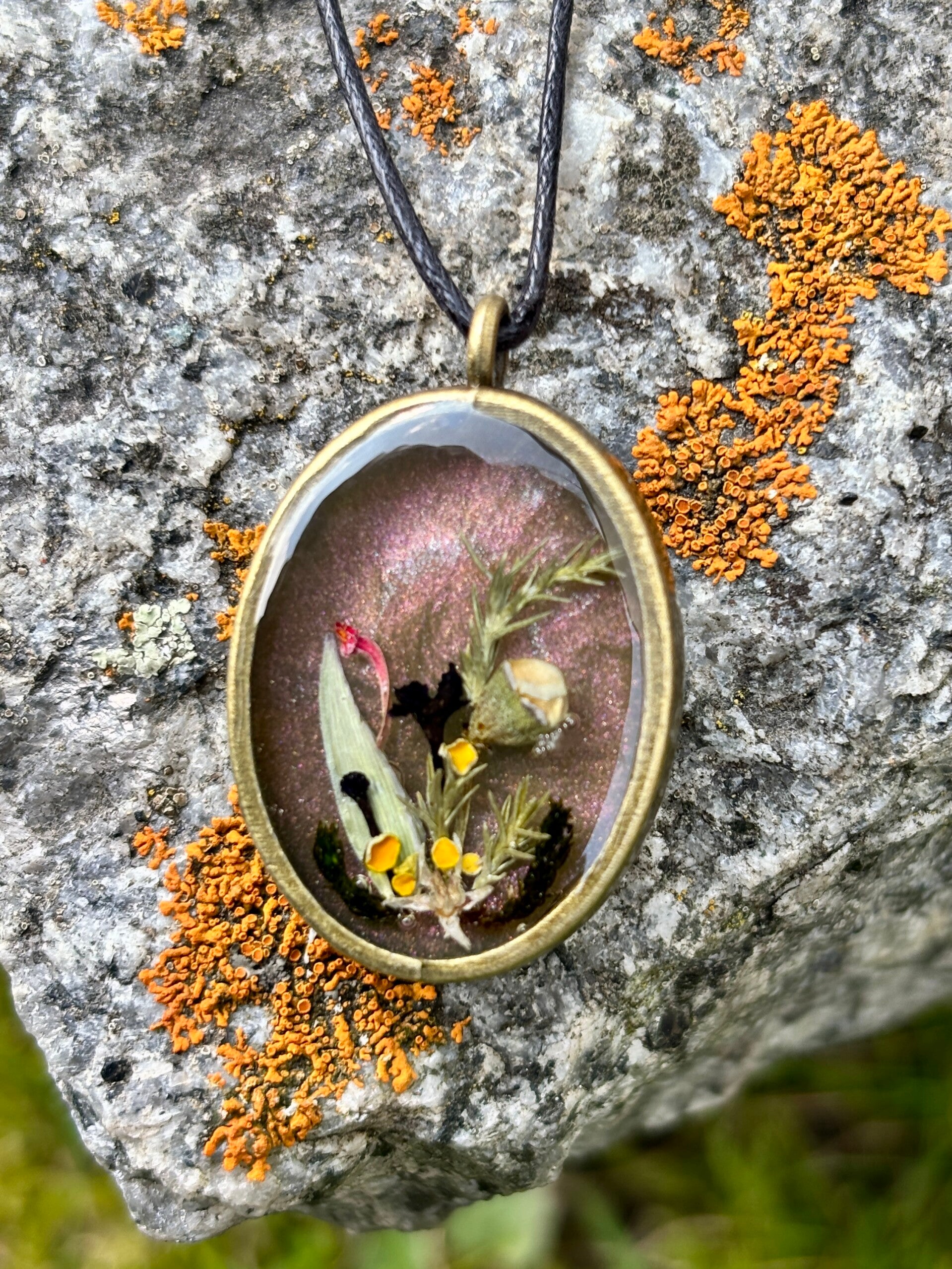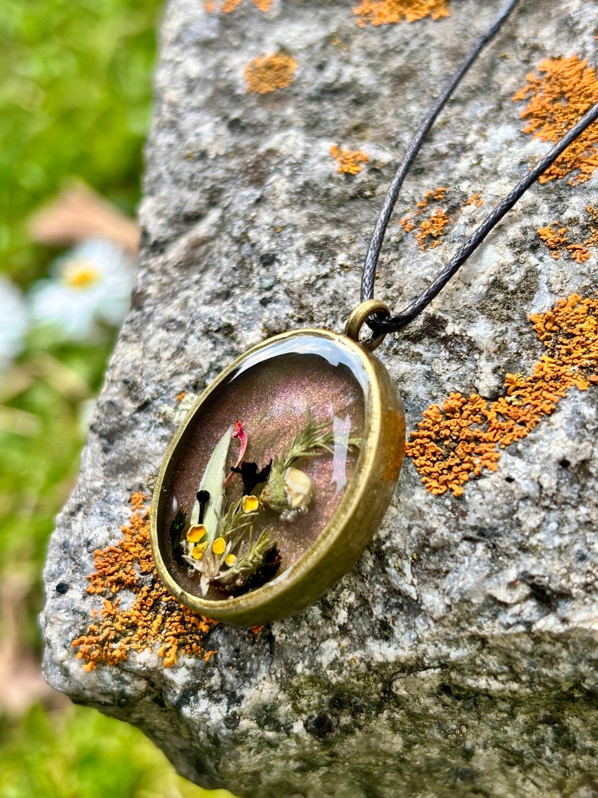 Für diesen Anhänger wurden ausschließlich echte Pflanzen verwendet. Da jede Blüte und jedes Flechtenstück einzigartig ist, gleicht kein Schmuckstück exakt dem anderen.
