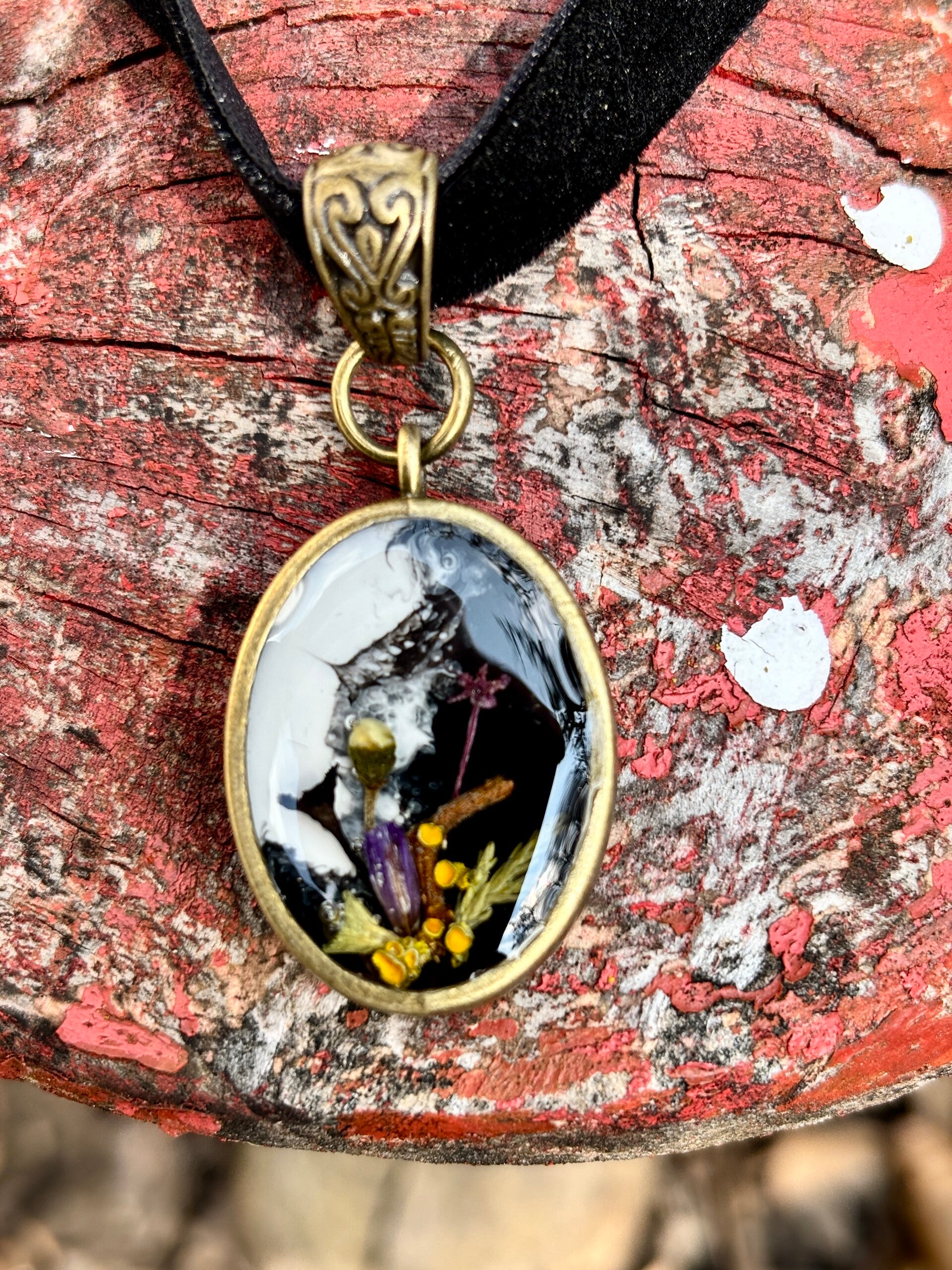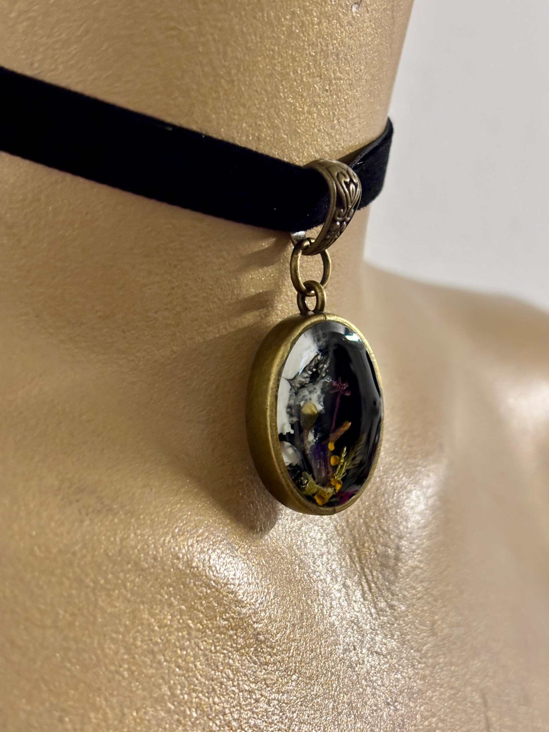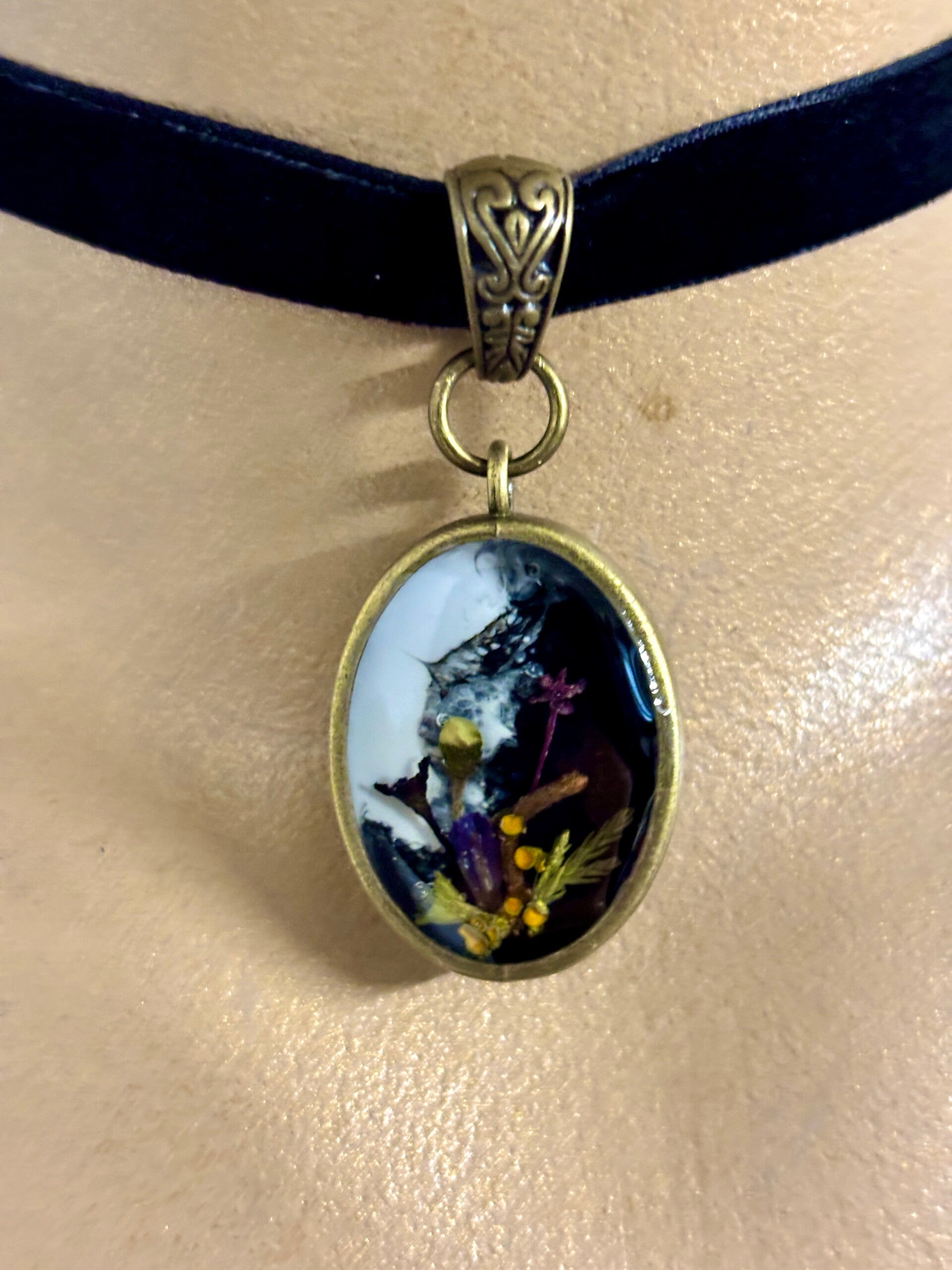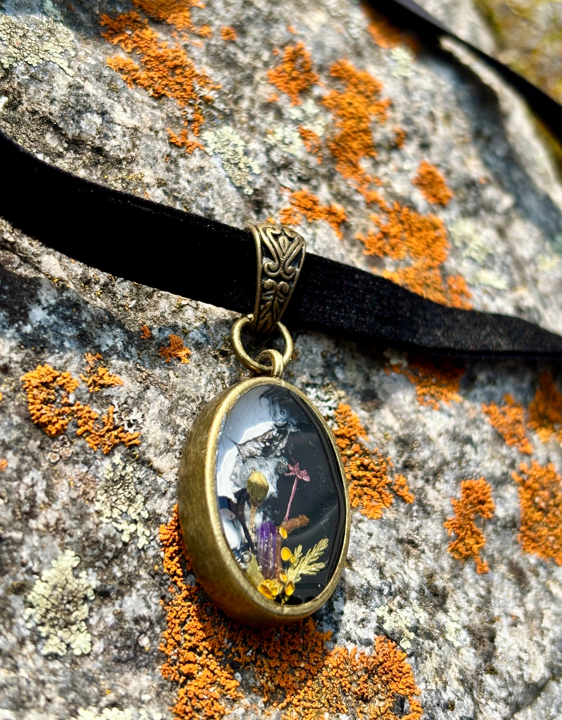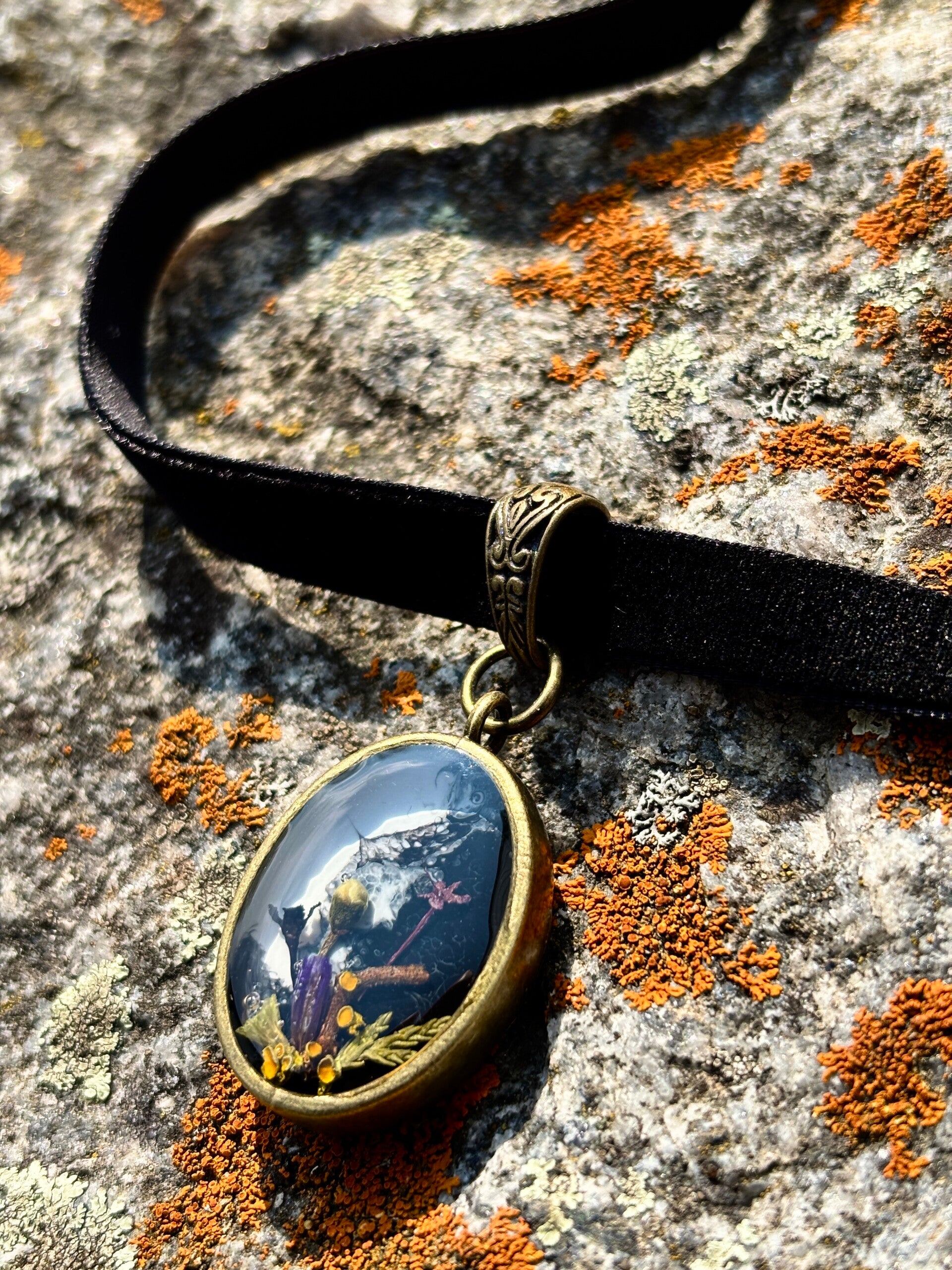 Diese handgefertigte Choker Kette aus schwarzem Samt mit einem waldmagischen Anhänger vereint echte Pflanzen aus der Natur mit klarem Epoxidharz zu einem einzigartigen Schmuckstück, das perfekt zum Dirndl, aber auch zum Alltagsoutfit passt. Die verwendeten Blüten und FLechten und Gräser werden sorgfältig gesammelt, schonend getrocknet und anschließend in liebevoller Handarbeit ins Harz eingebettet.