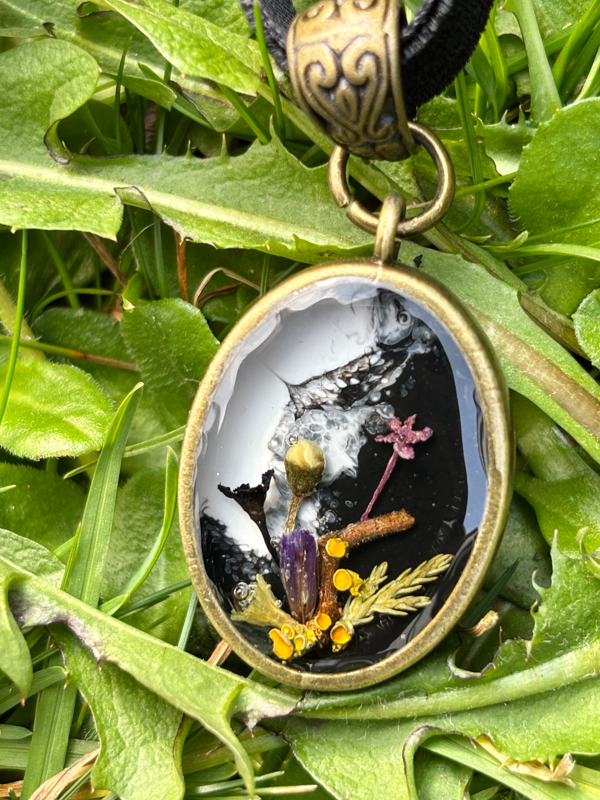 Für diesen Schmuck wurden ausschließlich echte Naturmaterialien verwendet. Dadurch gleicht kein Stück dem anderen – jede Blüte, jedes Blatt und jedes Moosstück macht den Anhänger zu einem einzigartigen Unikat.