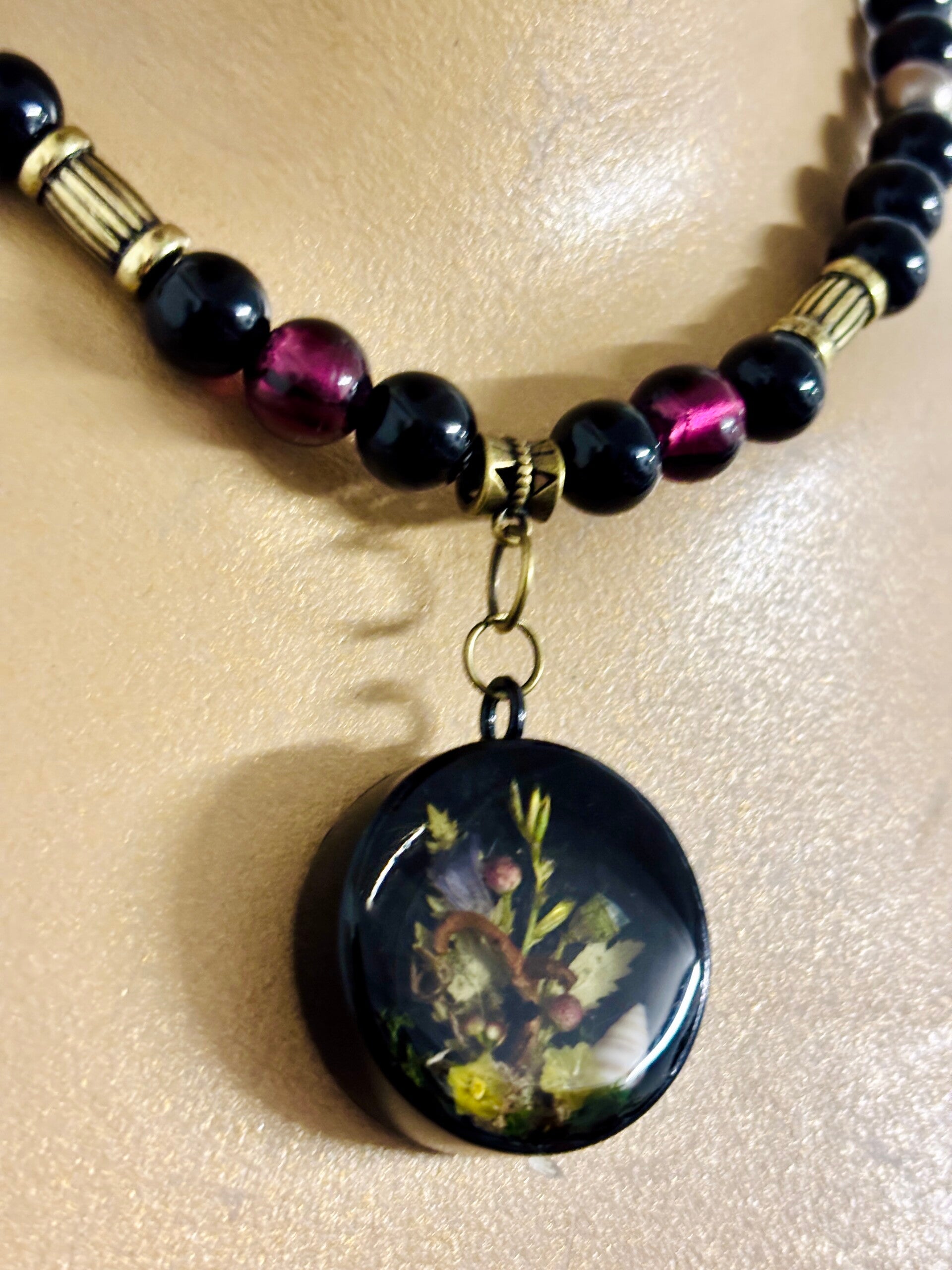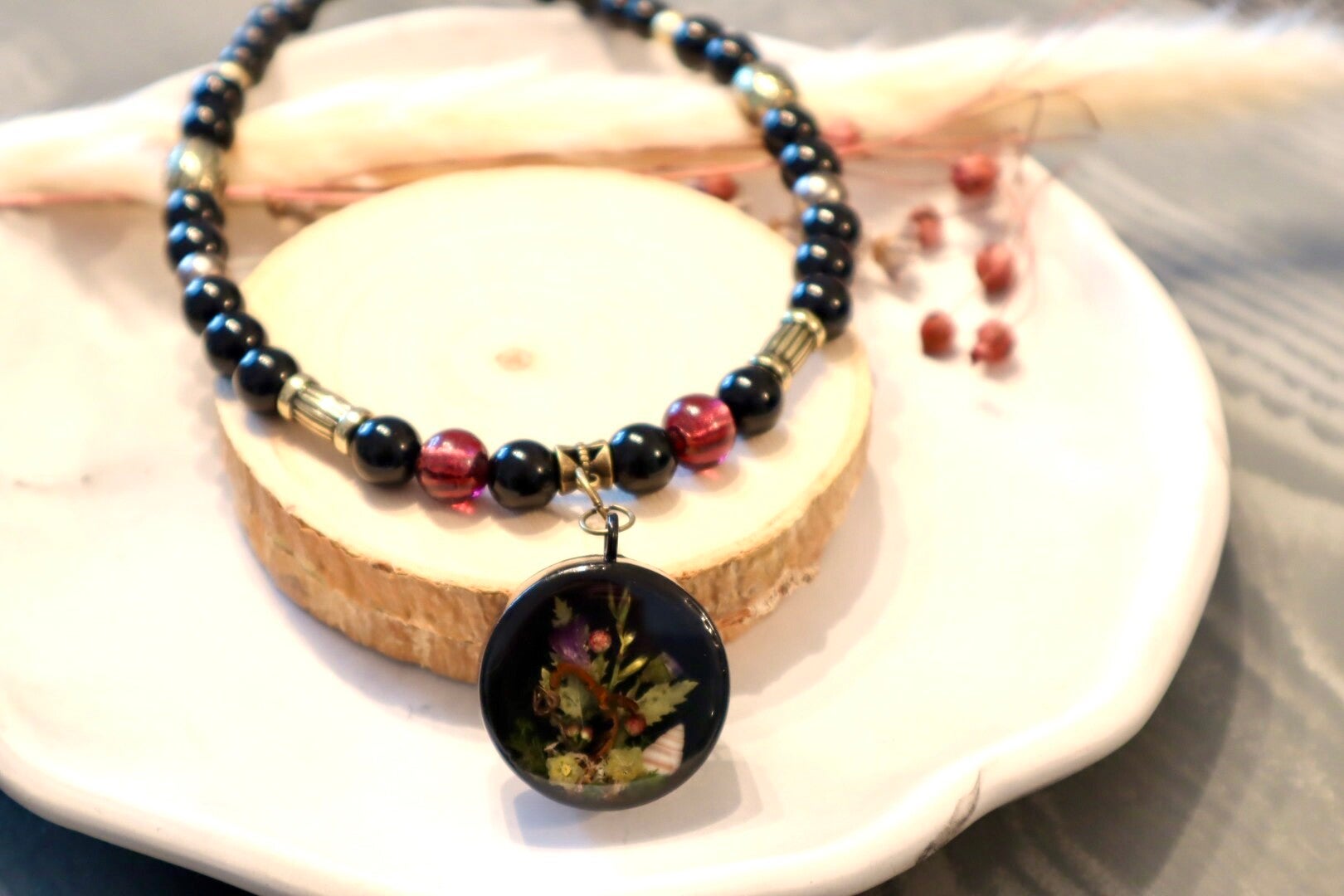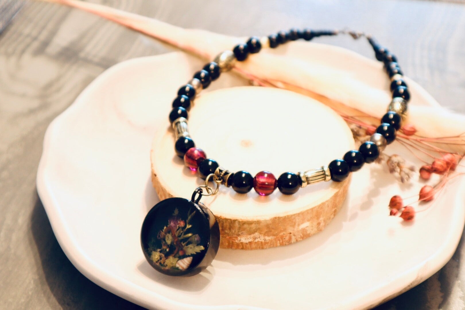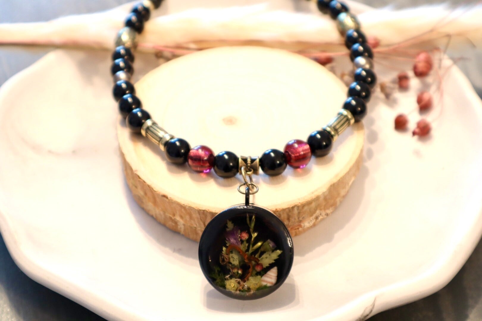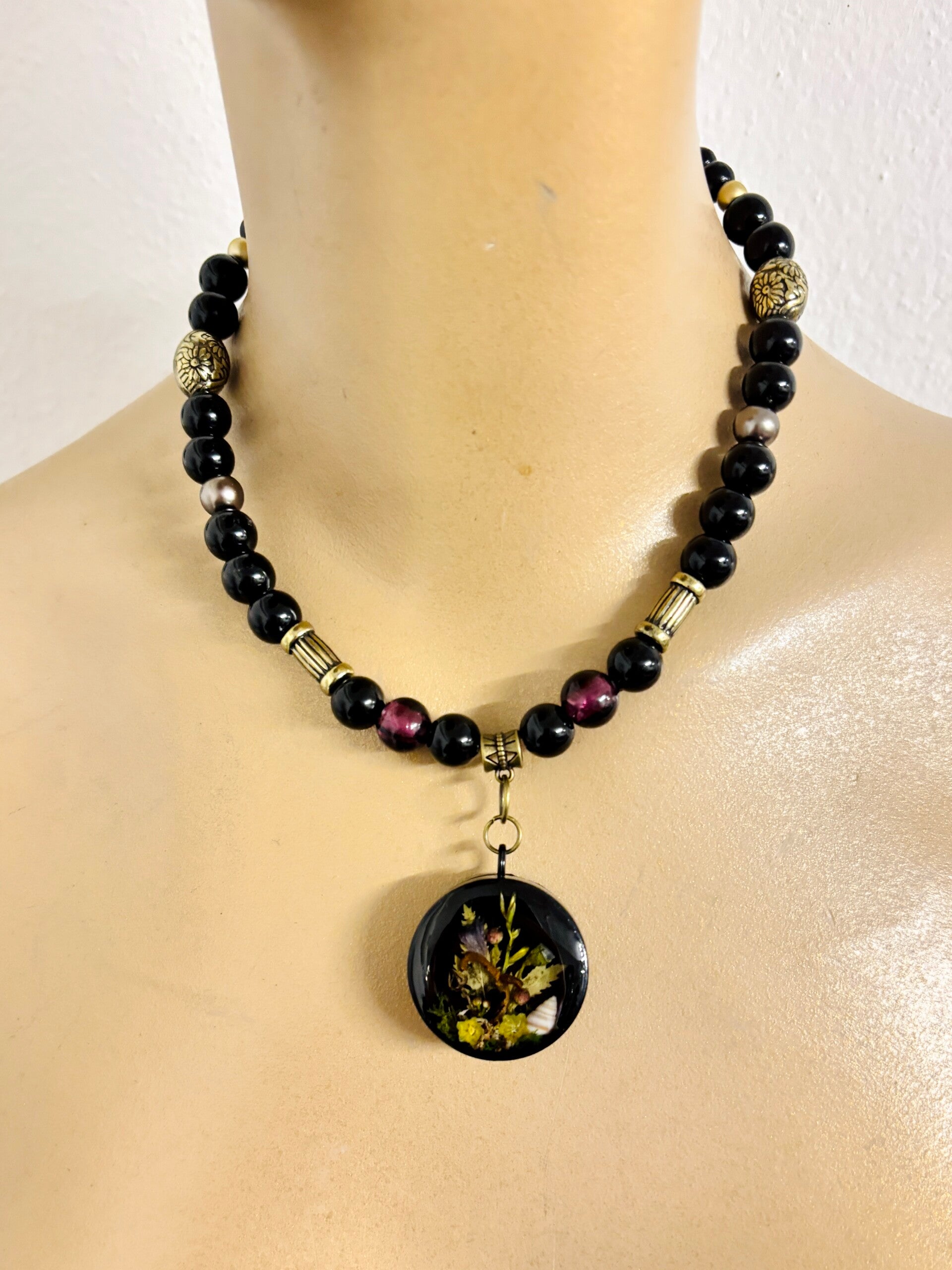 Dunkle Perlenkette mit Naturschmuck Anhänger - Waldschmuck Statement Kette