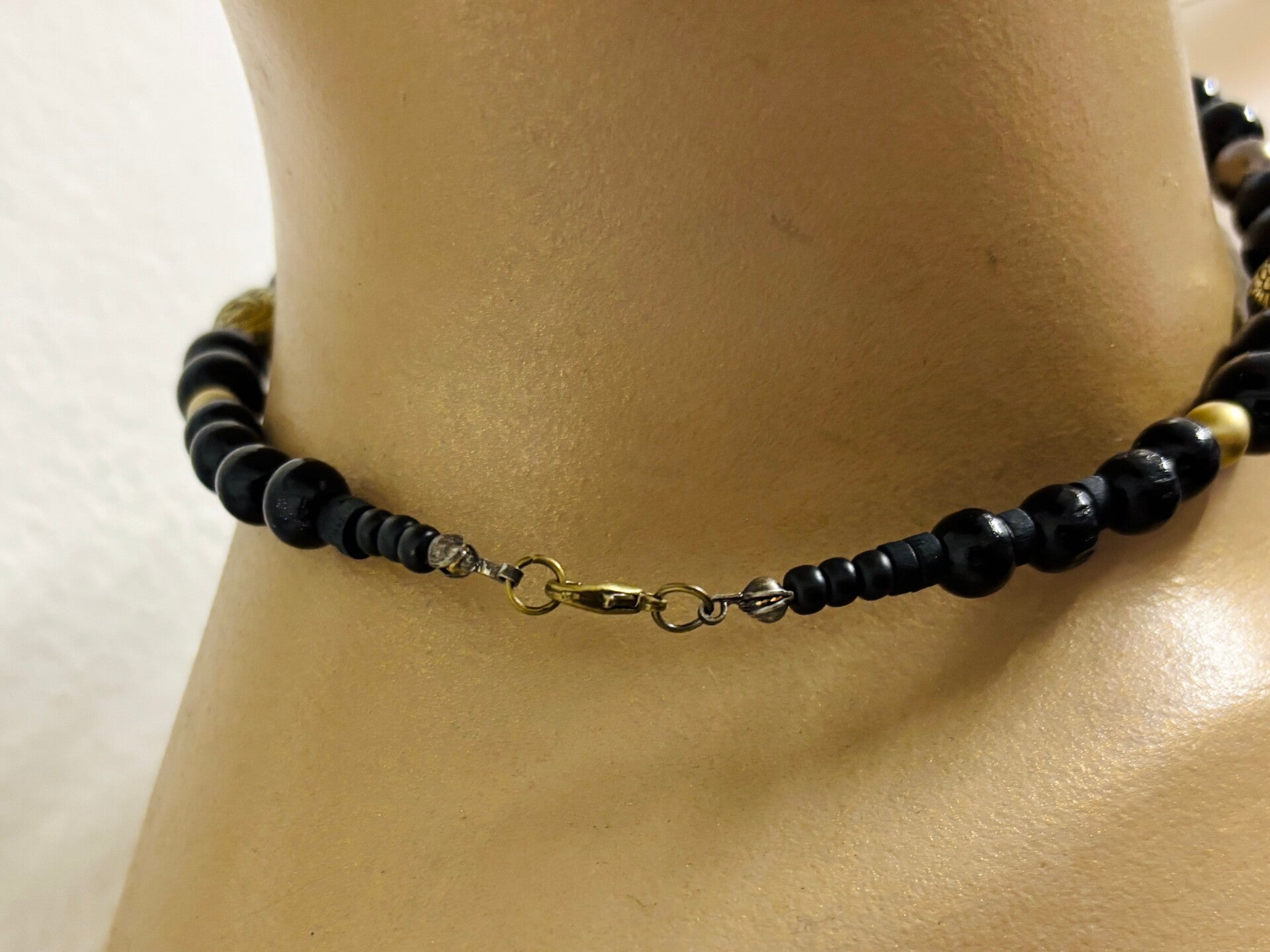 Die Kette wurde per Hand gefädelt und besteht aus einer harmonischen Kombination aus Holz- und Kunststoffperlen, ergänzt durch dekorative Metallakzente. Die dunklen Perlen unterstreichen den erdigen, waldverbundenen Charakter des Anhängers und machen die Kette zu einem besonderen Blickfang – sowohl im Alltag als auch zu besonderen Anlässen.