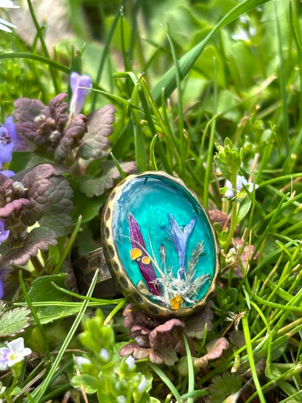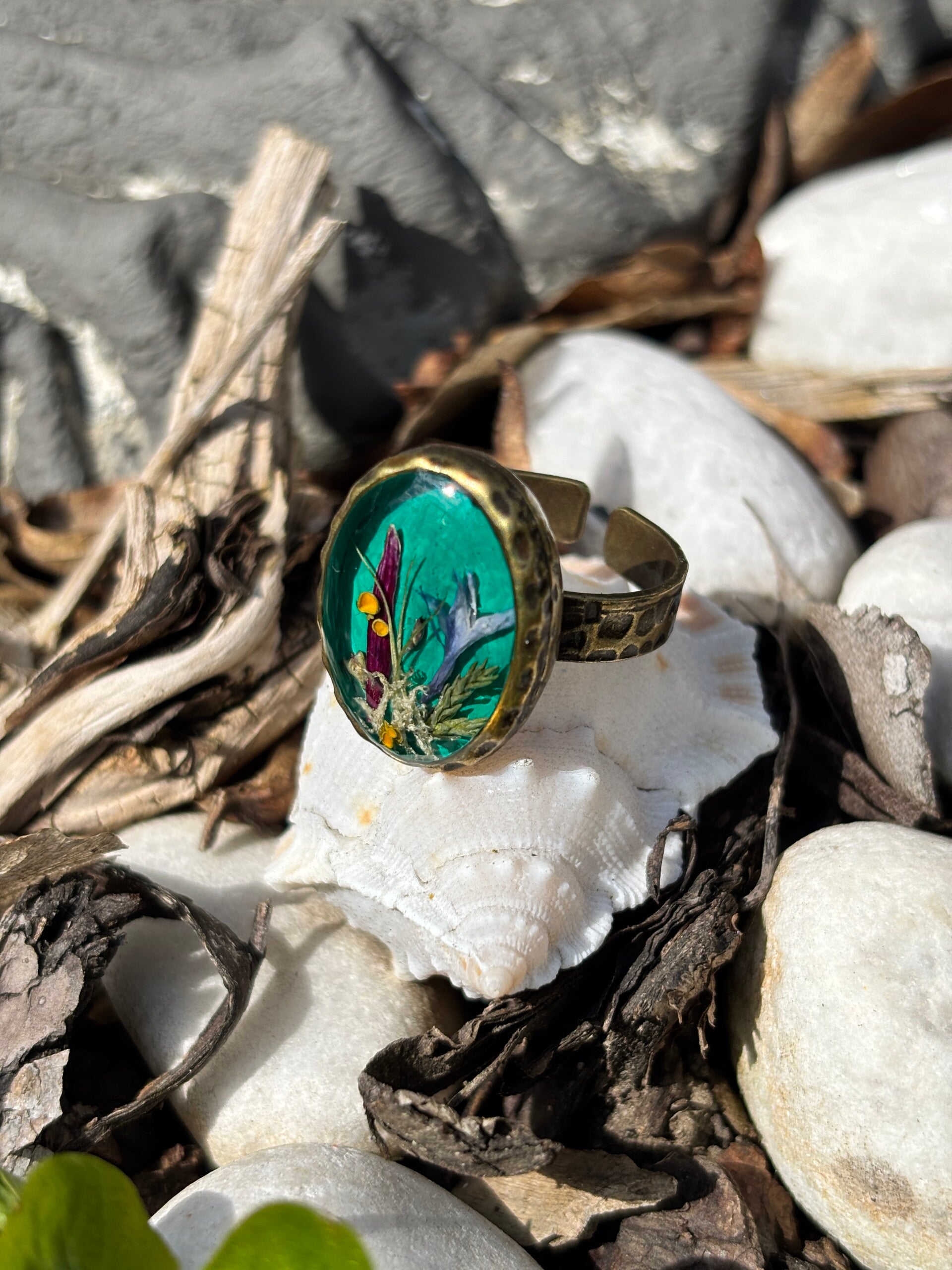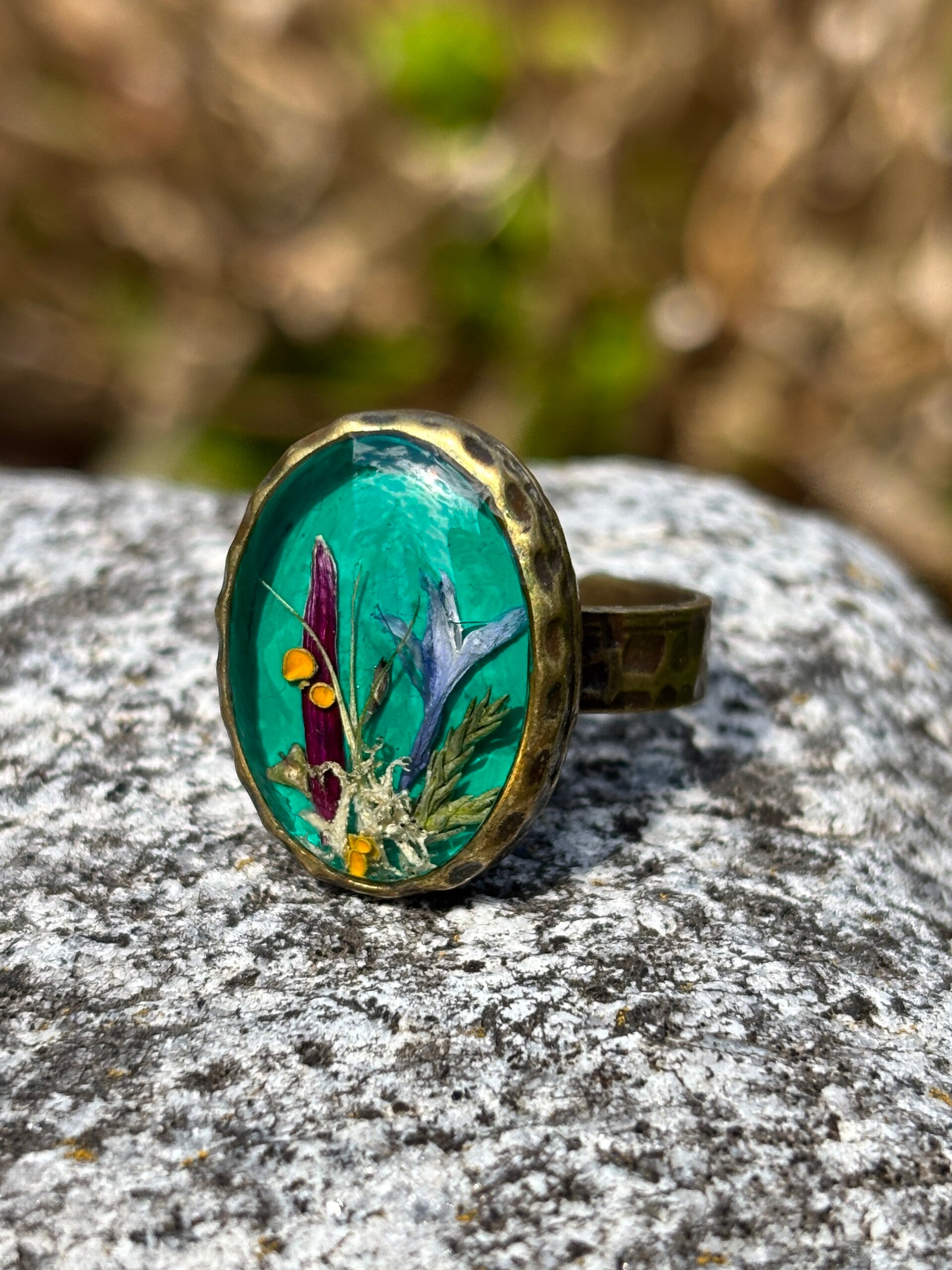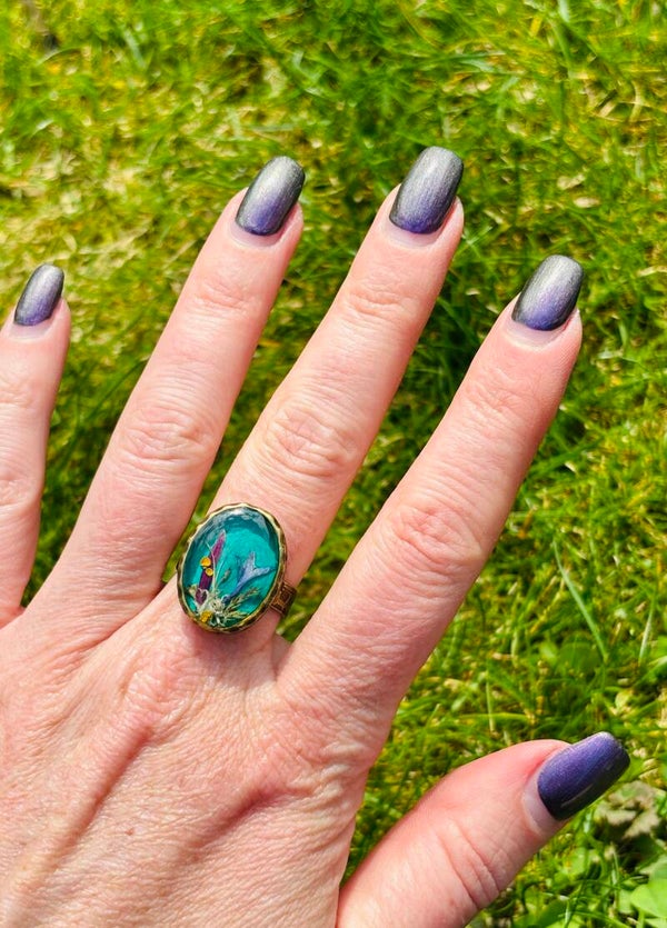 Dieser handgemachte Ring in türkis/petrol bewahrt die Schönheit echter Waldpflanzen in klarem Epoxidharz. Zarte Blüten, Gräser und Flechten wurden sorgfältig gesammelt, getrocknet und anschließend in liebevoller Handarbeit in den Anhänger eingebettet.