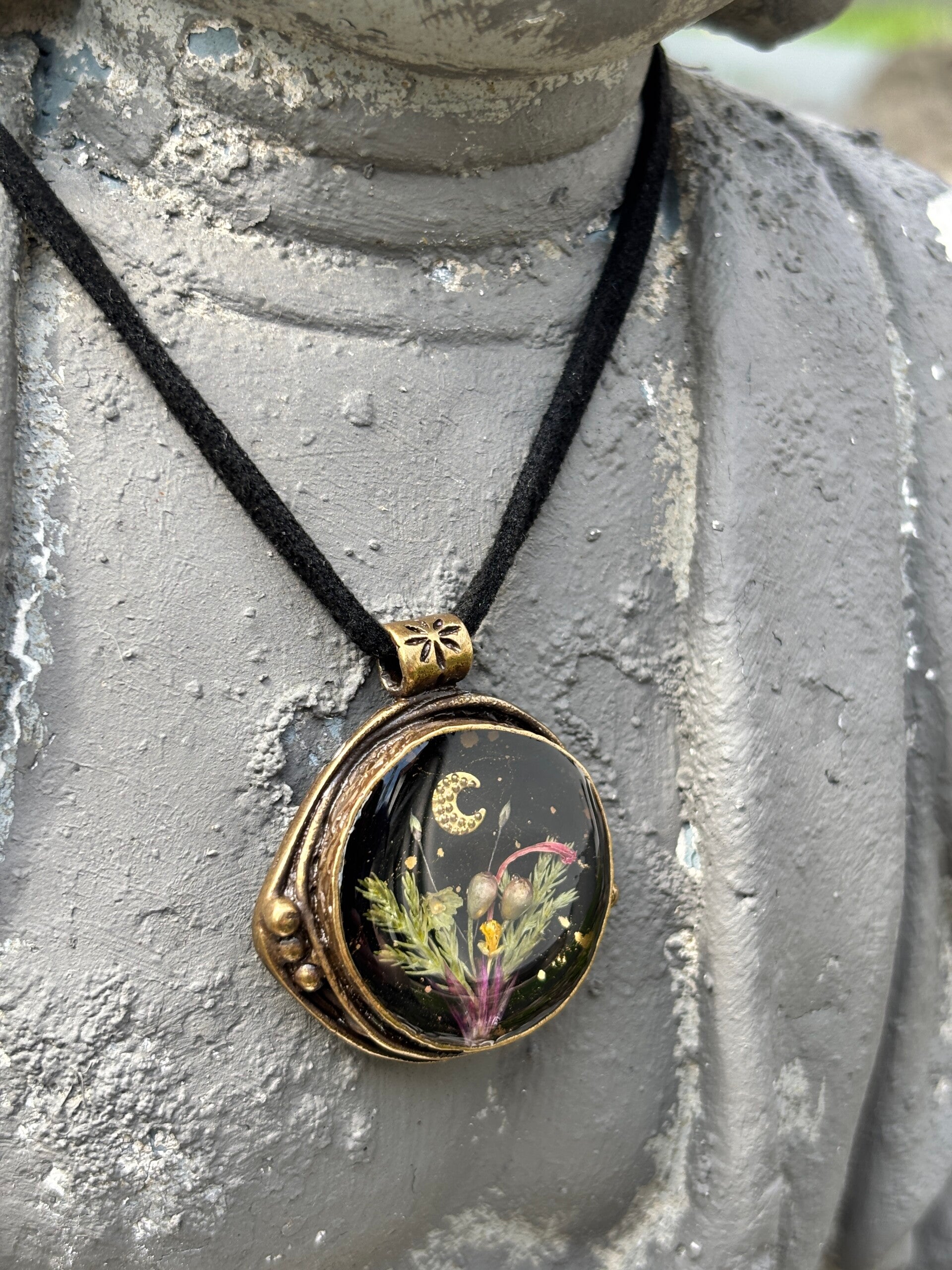 Statement Kette: Mondkette gold-schwarz - Halskette mit Anhänger aus Epoxidharz mit echter Zypresse, Federbusch Blüte und Gräsern, antik bronze, handgemachter Naturschmuck